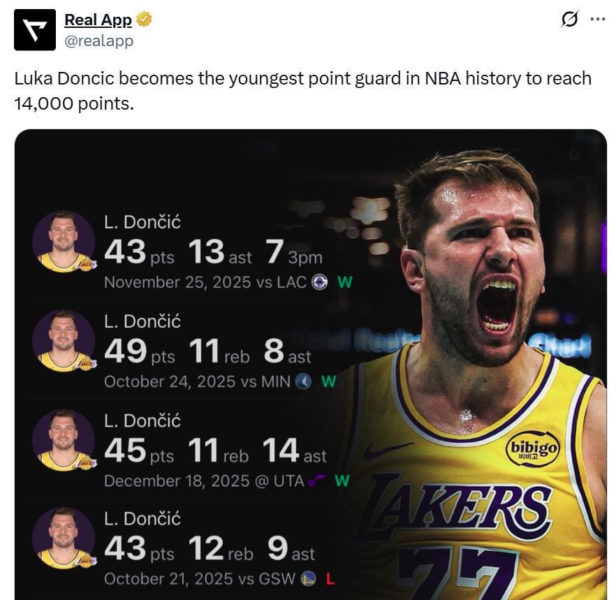 除此之外,本场比赛也是东契奇生涯14000分里程碑之夜,26岁327天的东契奇成为NBA历史上拿到至少14000分最年轻的控卫。